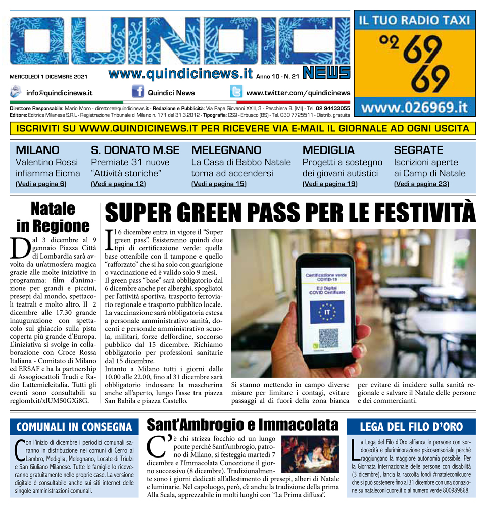 Ecco il nuovo numero di Quindici News: uscita numero 21 del 1° dicembre 2021.