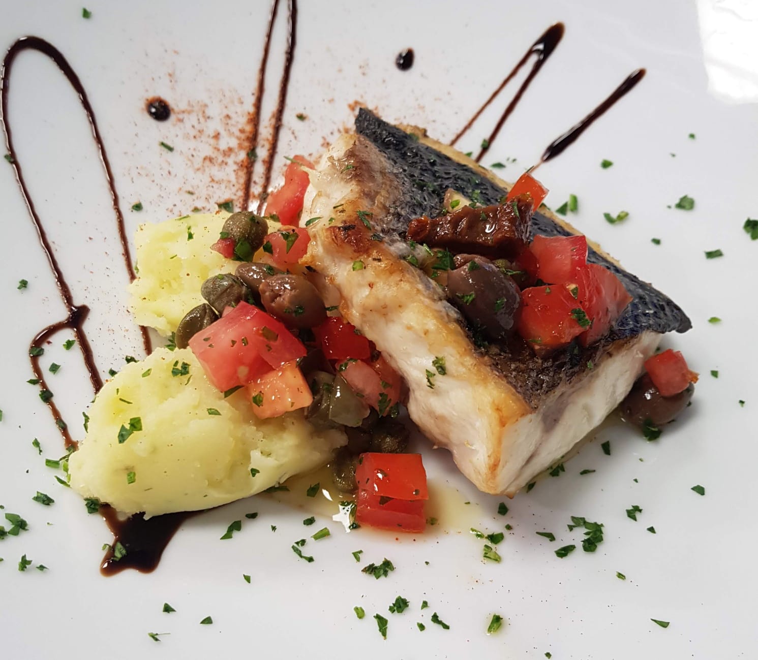 - Filetto di spigola spadellato con patate morbide e salsa crudaiola