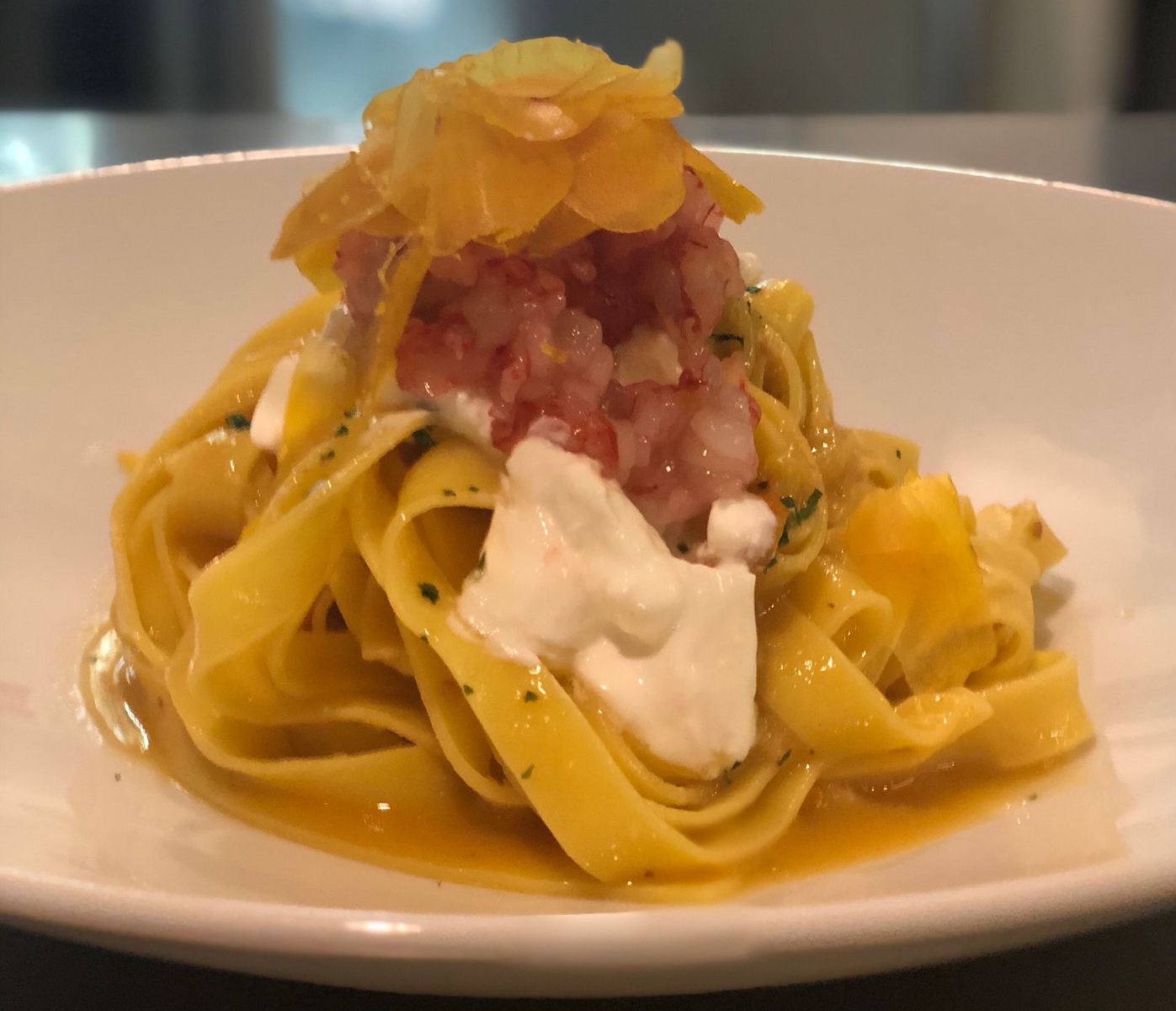 - Tagliatelle con gamberi rossi, burrata e bottarga dei pescatori di Orbetello