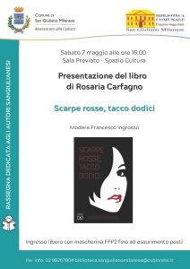 Sabato 7 maggio alle ore 16.00 presso la Sala Previato SpazioCultura in piazza della Vittoria a San Giuliano Milanese verrà presentato il nuovo libro di Rosaria Carfagno, il cui titolo è Scarpe rosse, tacco dodici.