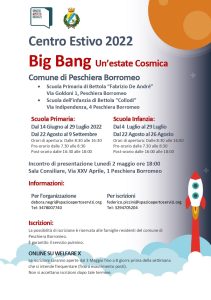Il tema sarà “Big Bang UN’ESTATE COSMICA” e coinvolgerà le bambine ed i bambini in una grande avventura le cui parole chiave saranno: esplorare, conoscere, scoprire, curiosare, e soprattutto divertirsi!