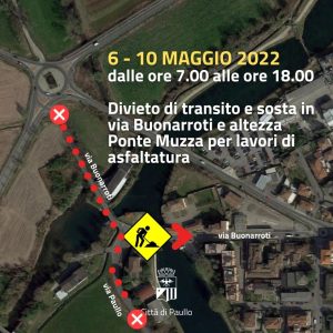 Dal 6 al 10 maggio 2022 è fatto divieto di transito e sosta in via Buonarroti e altezza Ponte Muzza dalle ore 7 alle ore 18 per lavori di asfaltatura.