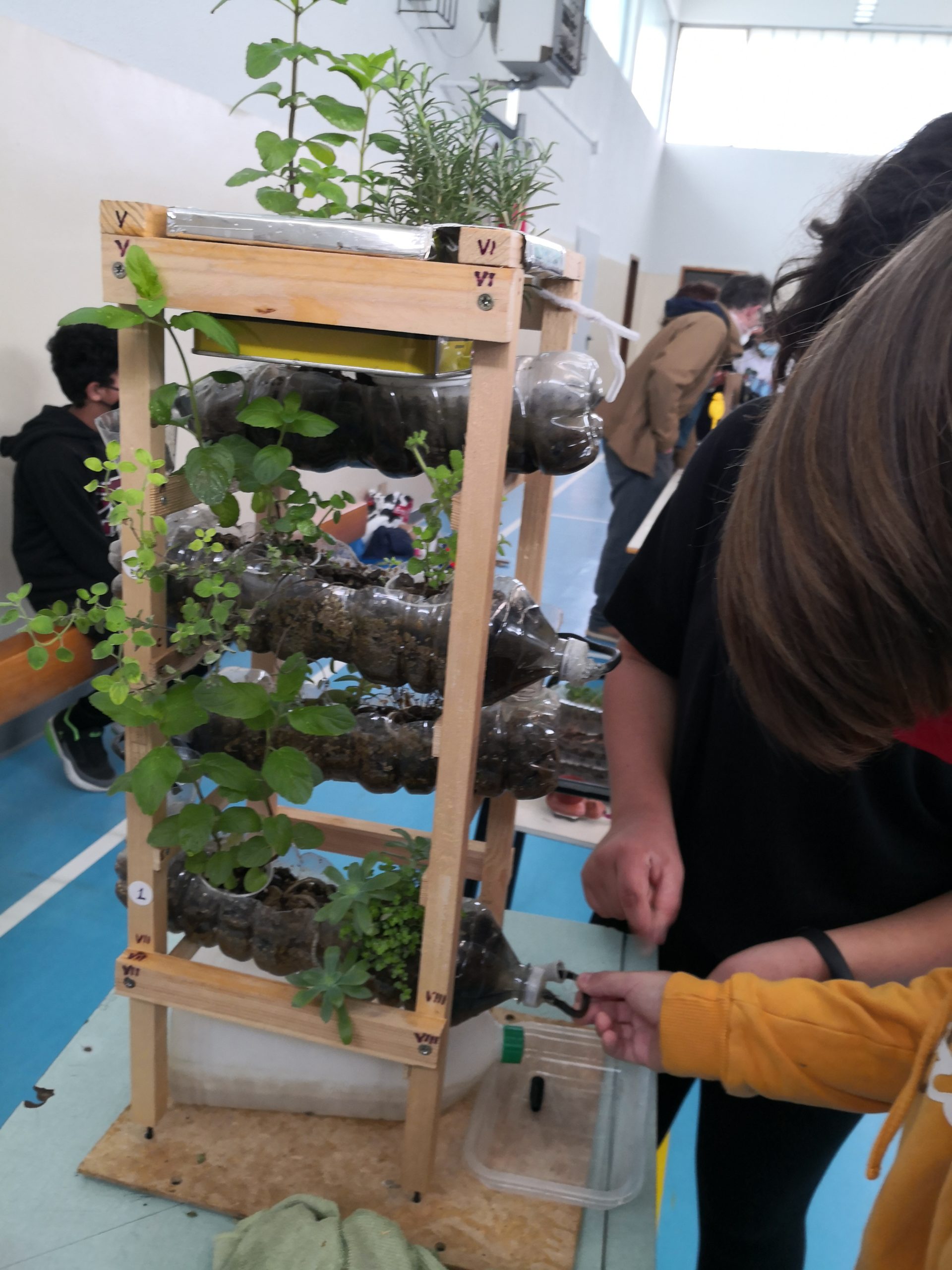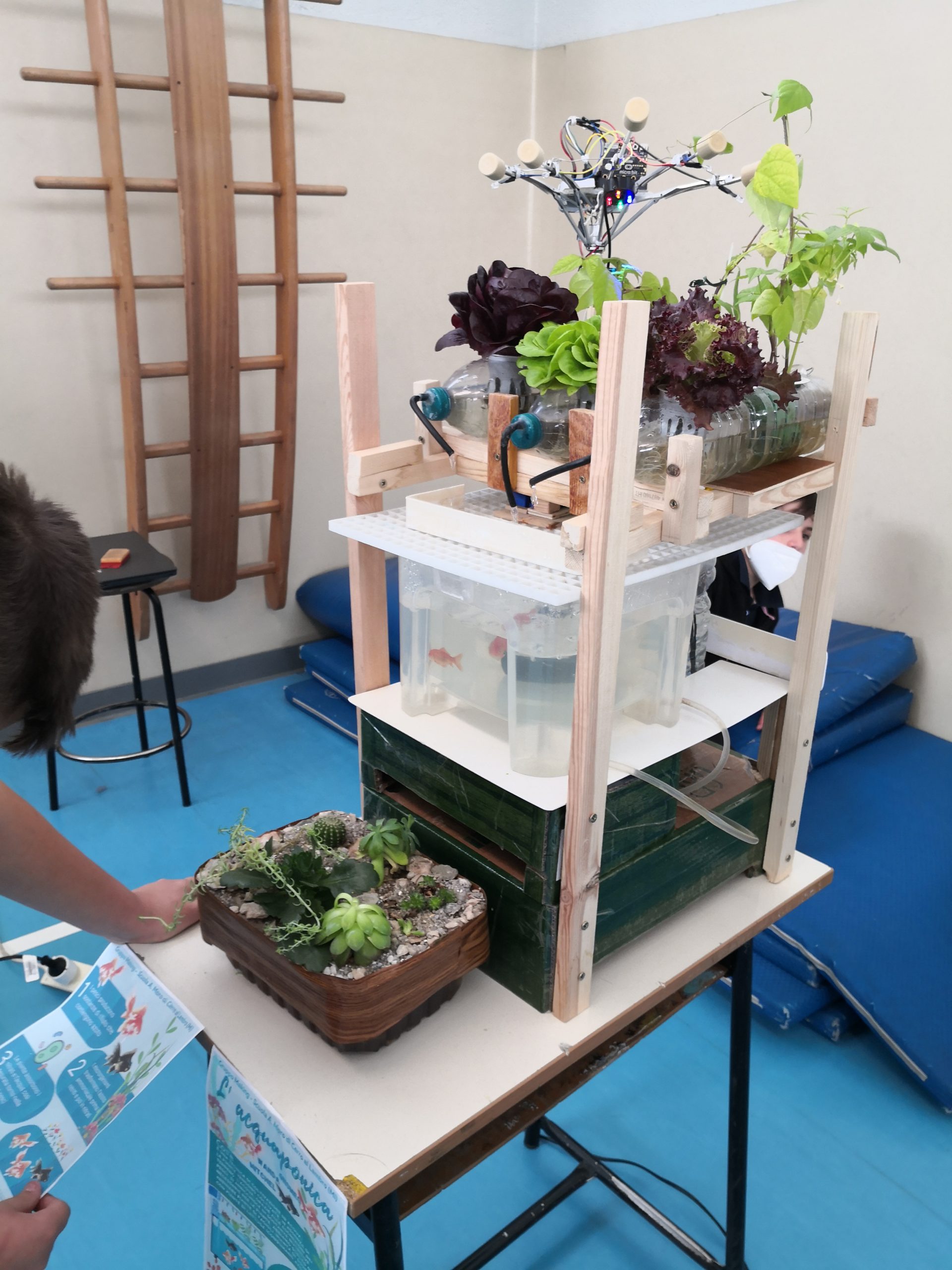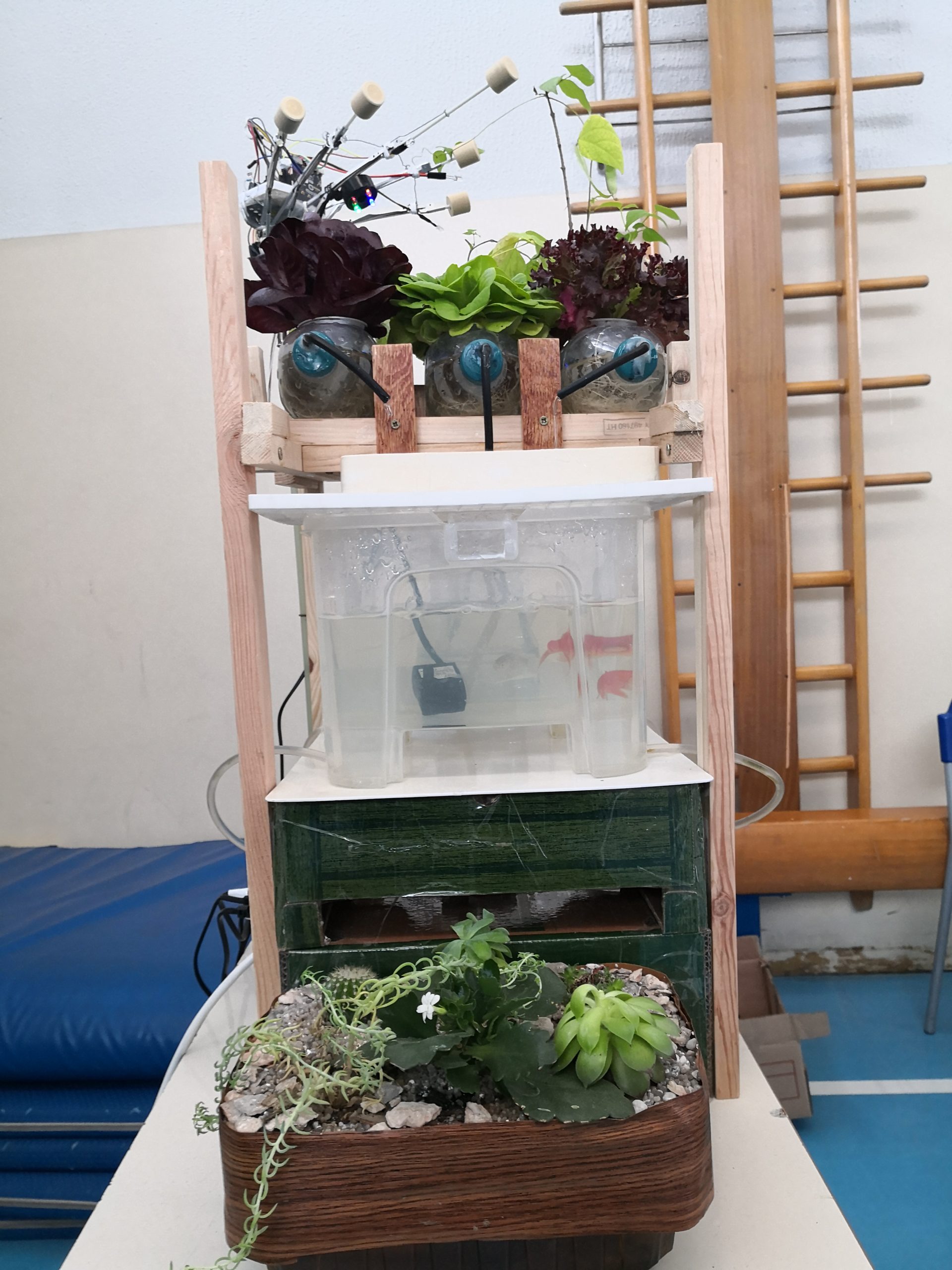 L’acquaponica è un sistema in cui convivono piante (abbiamo coltivato fagioli e insalata) e pesci. Pesci e piante vivono in differenti contenitori e condividono la stessa acqua, concimata dai pesci e filtrata da batteri e piante.