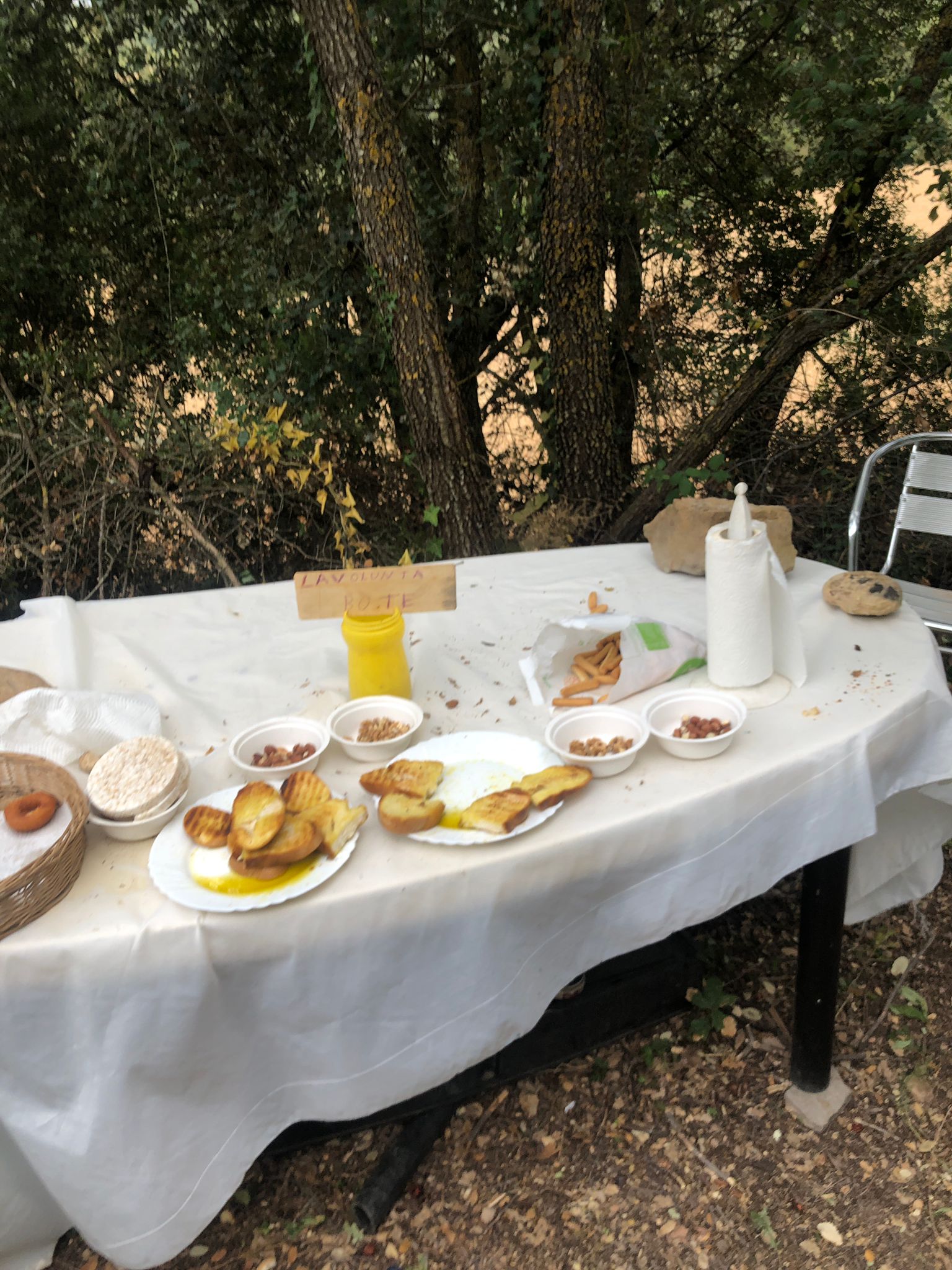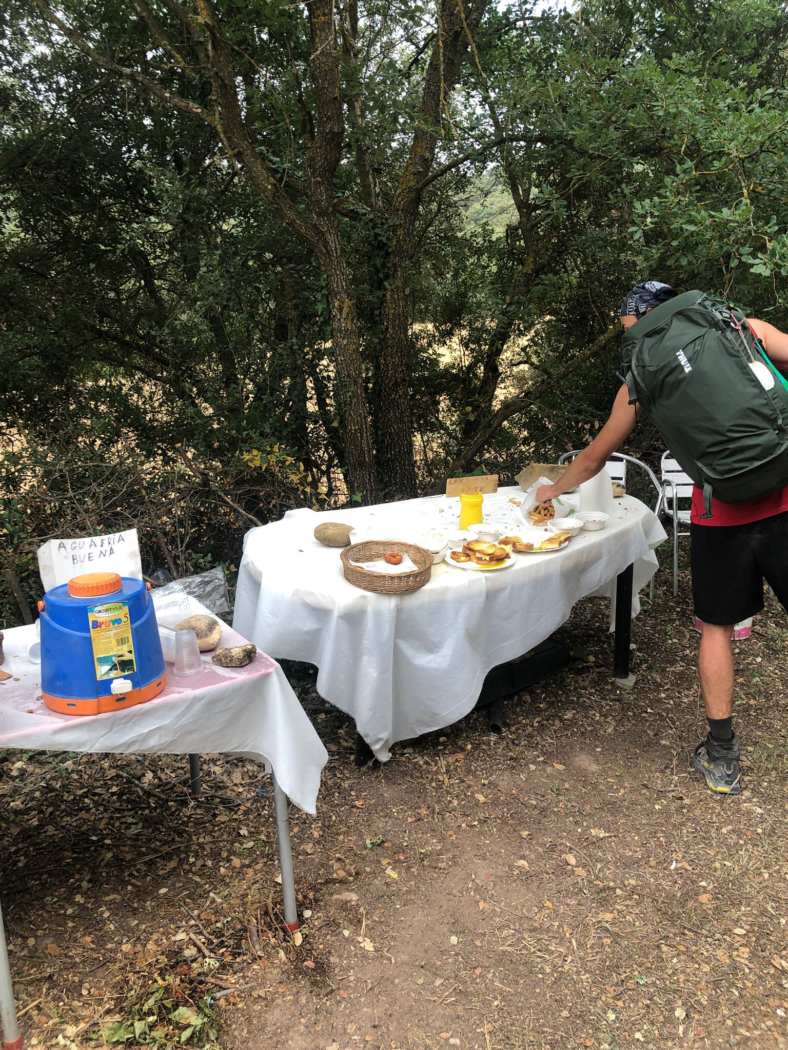 Lungo la strada troviamo dei piccoli siti “donativi” dove si lascia ciò che non ti serve e si prende ciò che serve. Il primo segna 676 chilometri a a Santiago. Poi dopo una salita impegnativa e aver attraversato un ponte romano è un altro sul fiume poco dopo, si arriva ad un donativo dove ci si può rifocillare con pane e olio, frutta secca, acqua fresca e prodotti tipici. Basta lasciare una piccola offerta.
