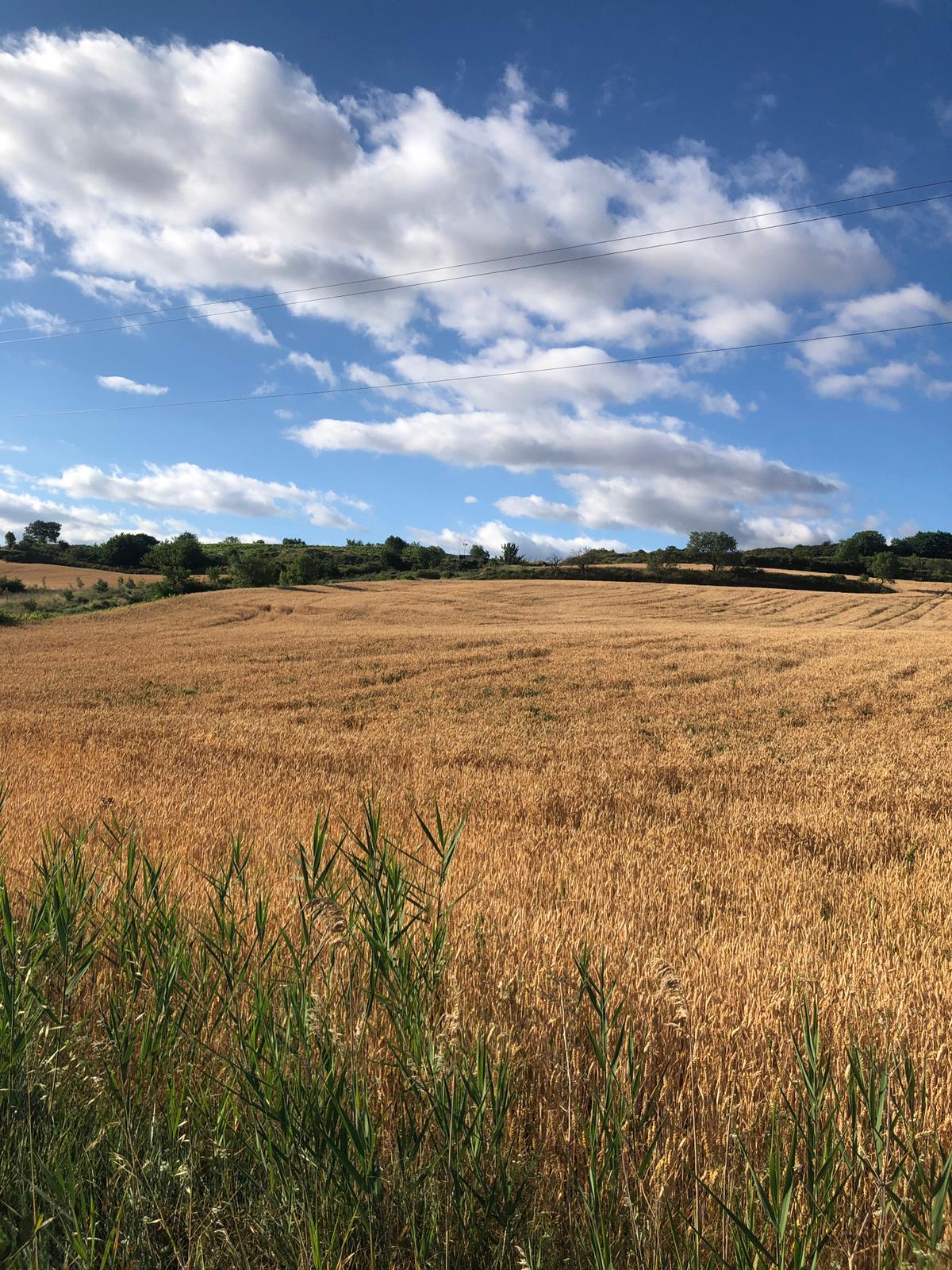 Si cammina tra le colline, con gli ormai caratteristici saliscendi sempre molto dolci ma tra campi di orzo e frumento. Colori bellissimi, il giallo dei campi, il verde delle colline e l’azzurro del cielo. Temperatura freschissima, ventilata. Partenza con circa 13°C fino ad una massima di 20ºC.