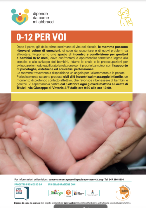 Ogni giovedì mattina dalle 9.30 alle 12.00 presso lo Spazio di Comunità di Via Di Vittorio 2/F, al secondo piano a Locate di Triulzi, spazio di incontro e condivisione per genitori e bambini 0/12 mesi.
