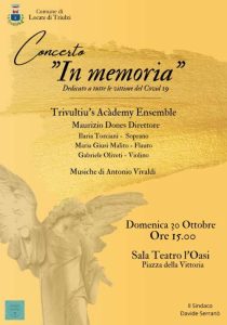 Domenica 30 Ottobre alle 15 in Sala Teatro l’Oasi a Locate di terrà il concerto “In memoria”, dedicato a tutte le vittime del Covid 19. Per l’occasione si esibirà Trivultiu’s Acàdemy Ensemble.