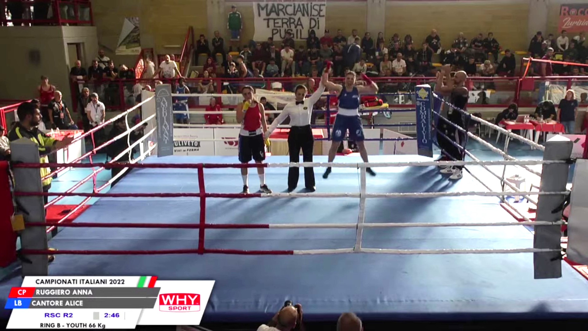“Cantore vince in maniera chiara, in maniera netta, questo titolo italiano”, con queste parole si chiude la telecronaca del giornalista Remo d’Acierno. Una vittoria schiacciante che ha portato l’arbitro a decretare la fine dell’incontro dopo il quarto conteggio inferto all’avversaria.