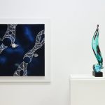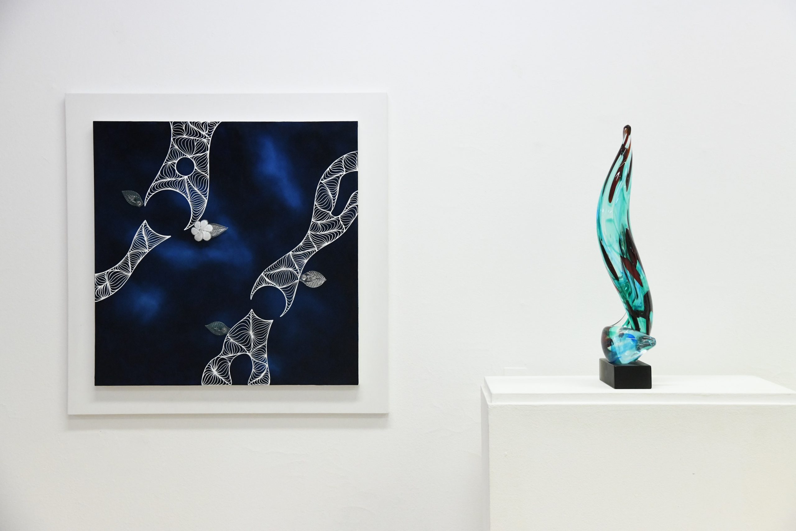 Tra le opere di nuova produzione sono esposte sculture in vetro, modellati con un famoso maestro vetraio di Murano, Giovanni Nicola, che rappresentano la fragilità della bellezza: pezzi unici realizzati in vetro di Murano con la tecnica della Murrina e della soffiatura, ispirate a “Le Città Invisibili” di Italo Calvino, l’opera in cui lo scrittore immagina nuove metropoli, aeree come i sogni e dense come le parole. Questa prima parte del percorso espositivo comprende anche alcune tele della serie “Kósmos” e “Argo” che rientrano nella pittura analitica di Claudio Oliveri, una corrente che trasforma l’opera in un oggetto di indagine di sé stessa: ne sono esempi i “cieli non cieli” che sono “estensioni di colore talora piatti, talora con rare sfumature su cui si innervano curve sinusoidali e frattali, o preziosi innesti di vetro a recuperare forme organiche, quasi con intenti barocchi”, come spiega il curatore della mostra Angelo Crespi.