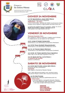 Le iniziative per giovani e adulti organizzate dal Comune di San Giuliano, in collaborazione con le tre Direzioni Didattiche, il Liceo “Primo Levi”, CISDA (Coordinamento Italiano Sostegno Donne Afghane), la rete interistituzionale “Fuori dal Silenzio” e le associazioni sportive, si svolgeranno giovedì 24, venerdì 25 e sabato 26 novembre 2022.