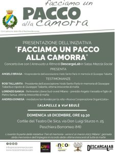 Facciamo un pacco alla Camorra, è questo il filo conduttore dell’iniziativa promosso con il patrocinio della città di Peschiera Borromeo. Si tratta di un concerto live con l’Arrevuoto a Ritmo di DescargaLab in salsa Mezcla Social. L’appuntamento è per domenica 18 dicembre alle 19.30 nel cortile del Teatro De Sica a Peschiera. Nella locandina il programma dettagliato.