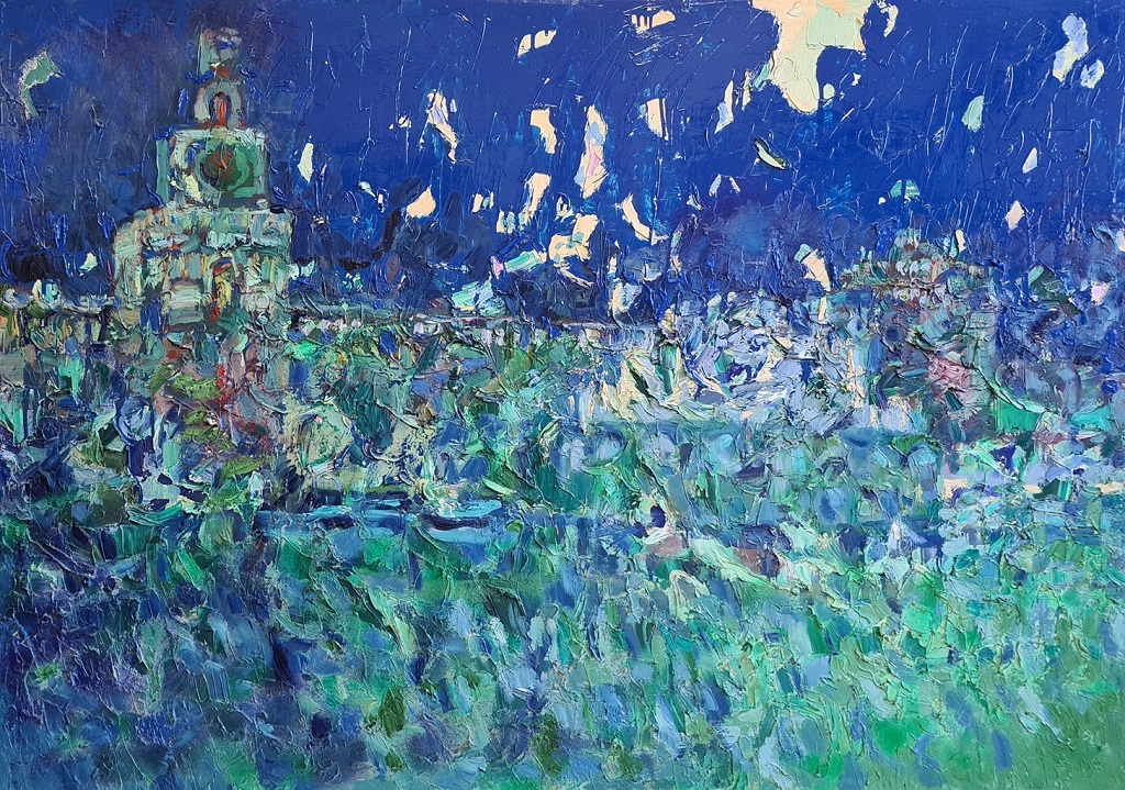 Solo dopo aver impresso l’idea del quadro sulla tela sopraggiunge il colore che cancella il tratto sottostante con pennellate corpose e spatolate generose, rimandi di colore, giustapposizioni tono su tono e contrasti chiaro-scuro, tutte “riflessioni” che restituiscono al componimento pittorico quello che l’artista definisce il ritmo musicale dell’opera.