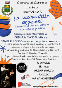 Nell’ambito della Festa di Primavera, prevista il 16 aprile, alle 17.00 a Cerro al Lambro ci sarà un interessante reading musicale dal titolo: “La cucina delle emozioni. Passioni di donne lette e suonate…a puntino”.