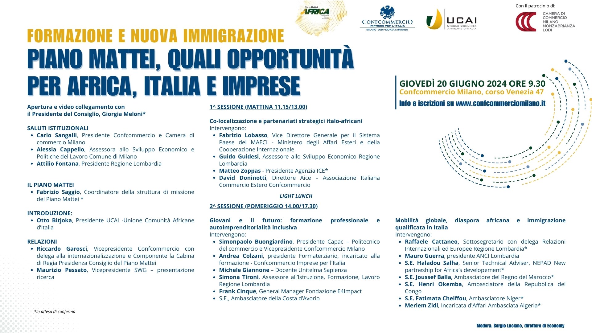 E’ in programma giovedì 20 giugno in Confcommercio Milano l’evento “Piano Mattei, quali opportunità per Africa, Italia e imprese”.
