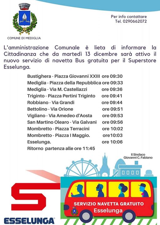 Il Comune di Mediglia ricorda ai Cittadini che è attivo il servizio navetta per il supermercato Esselunga di Pantigliate tutti i martedì, di seguito tutte le fermate e gli orari.