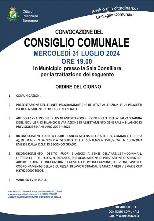 E’ stato convocato per il 31 luglio 2024 alle ore 19.00 il consiglio comunale a Peschiera Borromeo.
