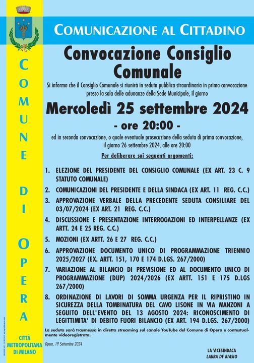 La seduta sarà trasmessa in diretta streaming sul canale YouTube del Comune di Opera e contestualmente videoregistrata.