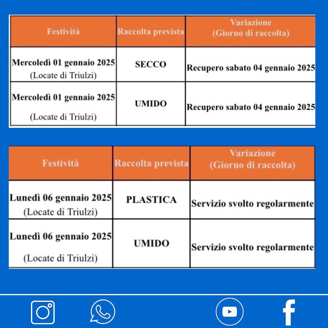 Il Comune di Locate comunica alla Cittadinanza che, in considerazione della chiusura degli impianti di conferimento durante le festività di mercoledì primo gennaio e lunedì 6 gennaio, verranno apportate le variazioni al calendario di servizio di raccolta dei rifiuti come da tabella riportata qui sotto.