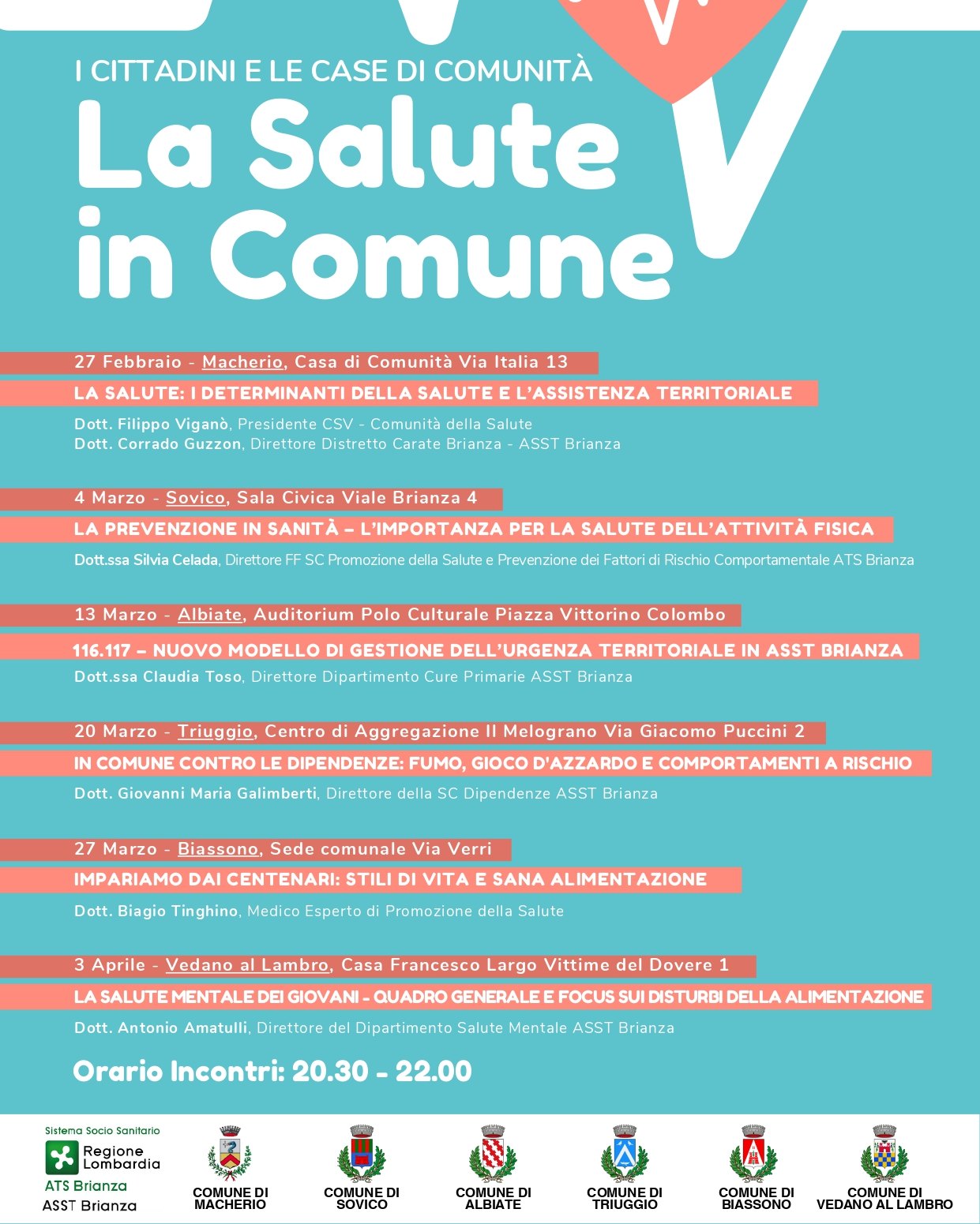 Al via giovedì 27 febbraio il ciclo di incontri “La salute in Comune – I cittadini e le Case di Comunità”, organizzato da ASST Brianza e ATS Brianza con i Comuni di Macherio, Sovico, Albiate, Triuggio, Biassono e Vedano al Lambro.