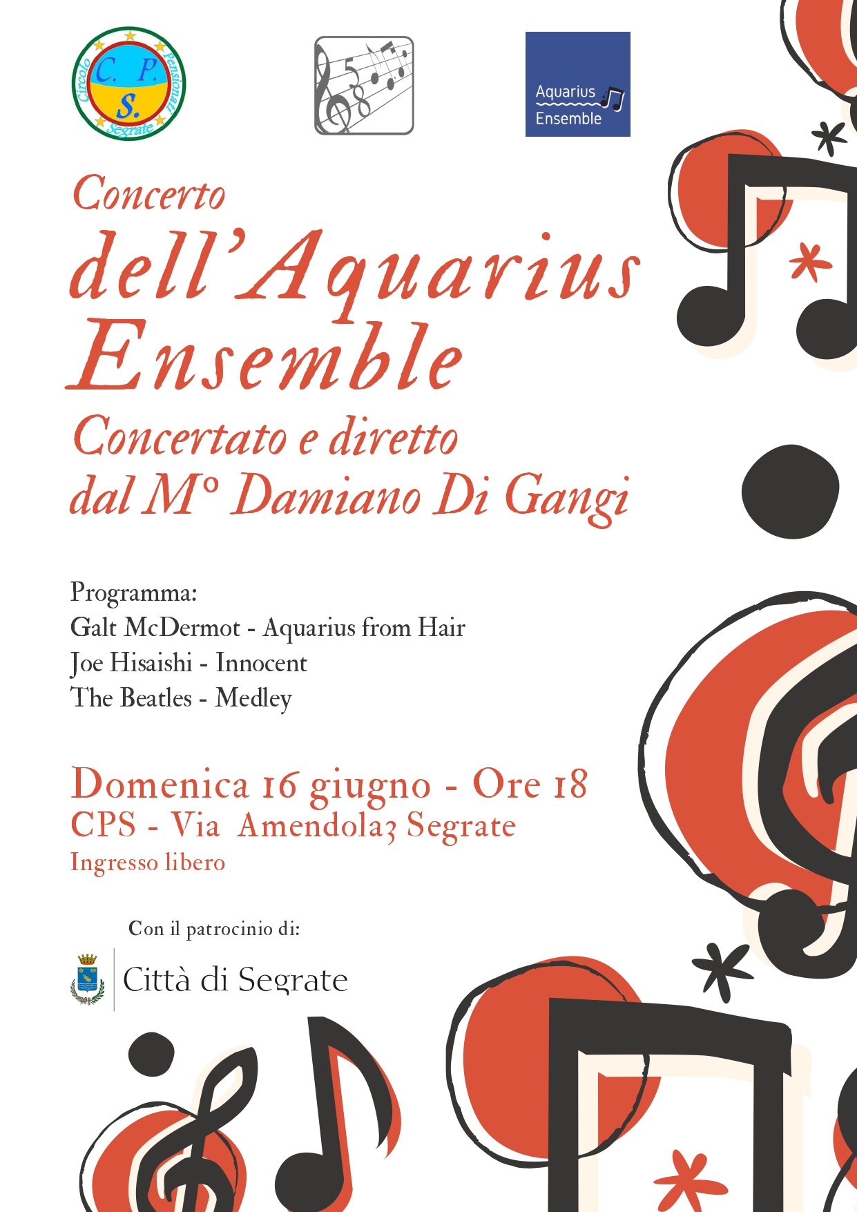 Domenica 16 giugno dalle ore 18 presso la sede del Circolo Pensionati Segrate (via Amentdola, 3 - Rovagnasco) concerto, patrocinato dal Comune di...