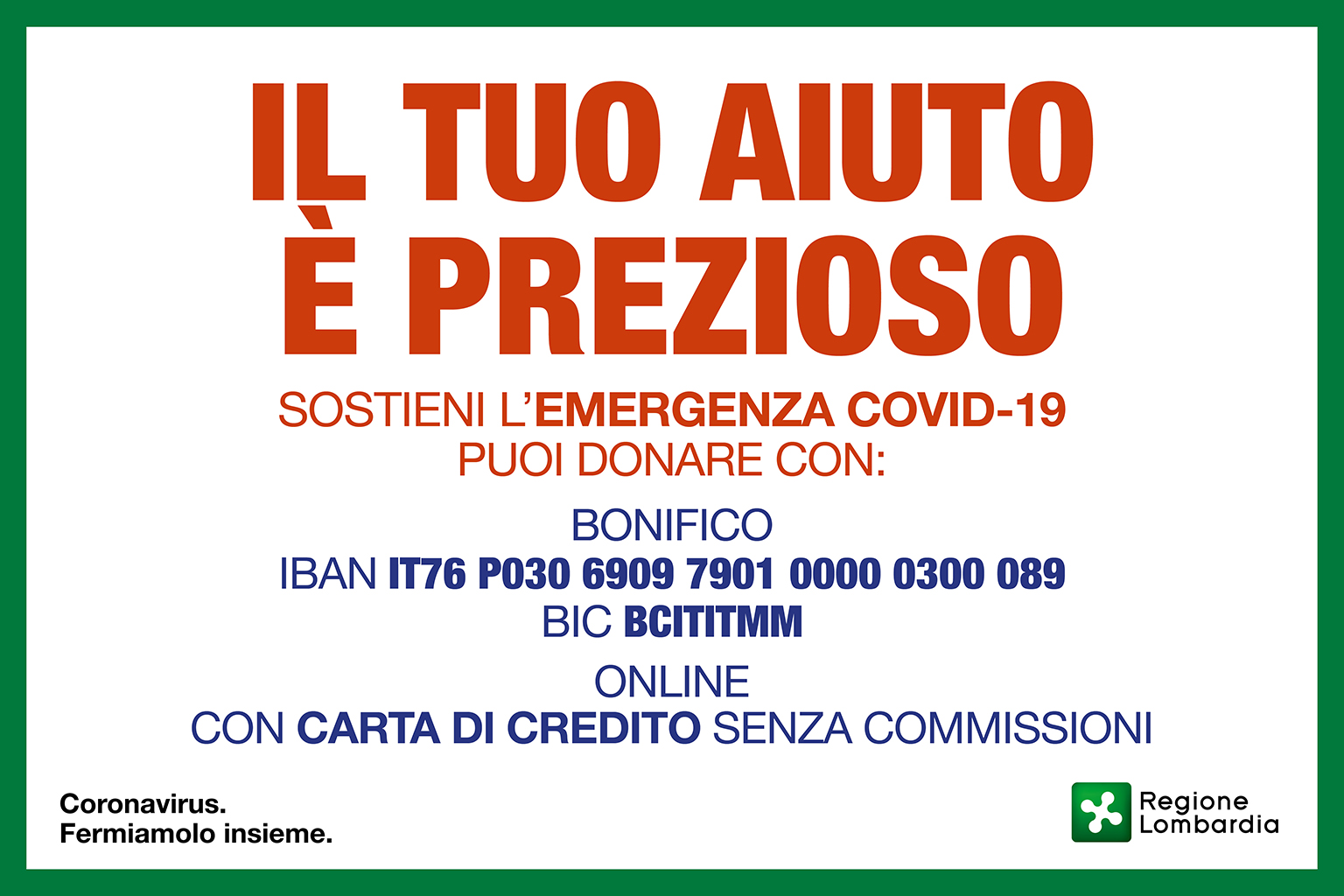 È disponibile un conto corrente dedicato a sostenere lo sforzo del personale sanitario della Lombardia impegnato in prima linea contro l’emergenz...